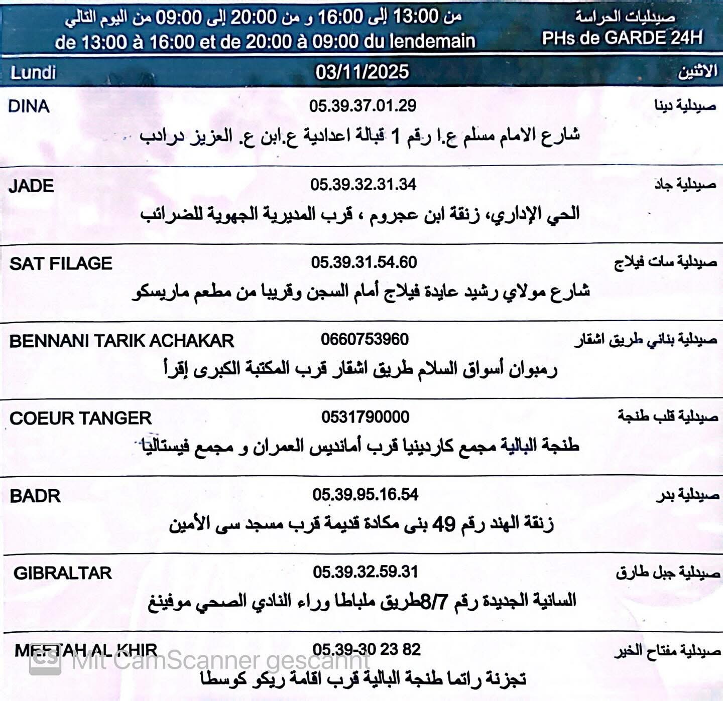 صيدليات الحراسة في طنجة – Pharmacies de garde à Tangerاكتشف لائحة صيدليات الحراسة في طنجة لهذا اليوم مع العناوين وأوقات العمل. خدمة محدثة يوميًا لمساعدتك في العثور على أقرب صيدلية مفتوحة الآن: إعلان