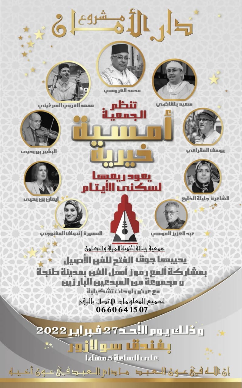 ولتحقيق هذا الحلم ارتأت الجمعية على تنظيم أمسية خيرية بمشاركة تضامنية لألمع الوجوه الفنية والأدبية بالمدينة، وسيتضمن الحفل فقرات فنية وموسيقية مختلفة وقراءات شعرية ومعرض للوحات الإبداعية والكتب الأدبية يعود ربحها الصافي لفائدة المشروع، كما سيتم الإعلان أثناء الحفل عن مساهمات الأشخاص الحاضرين الذين أردوا أن يتبرعون، إضافة إلى ذكر أسماء المحسنين الذين سيساهمون في تحقيق المبتغى، وعليه تتشرف الجمعية بدعوة المحسنين و المهتمين الذين يردون المساهمة في هذا العمل الخيري الإنساني.