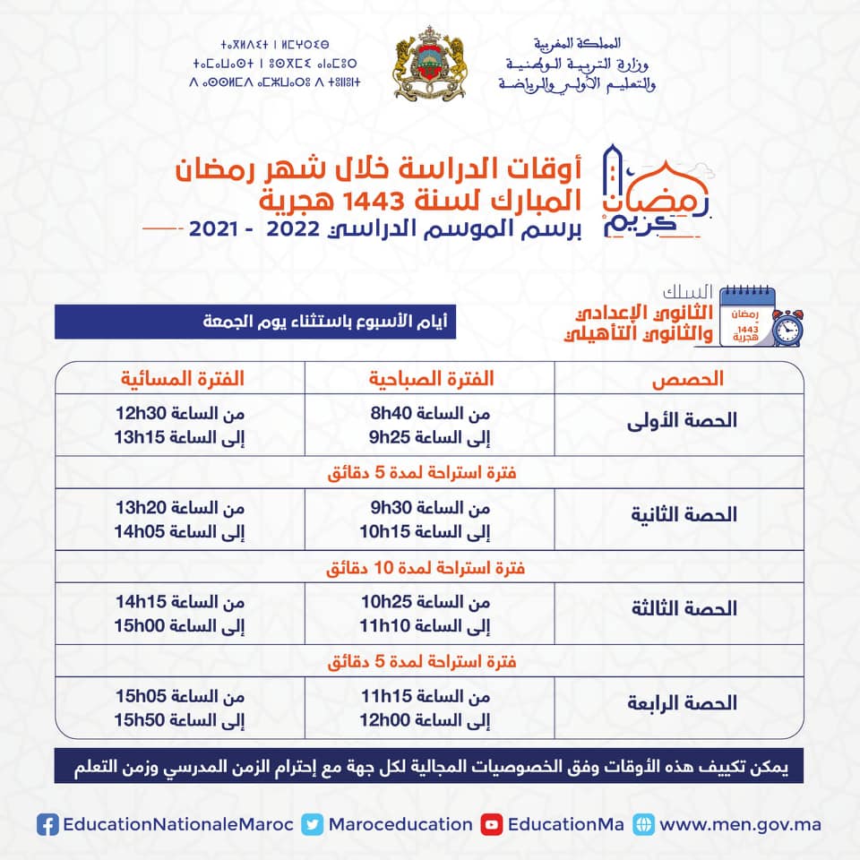 أعلنت وزارة التربية الوطنية والتعليم الأولي والرياضة، الجمعة، عن أوقات الدراسة خلال شهر رمضان المبارك، برسم الموسم الدراسي 2021-2022.