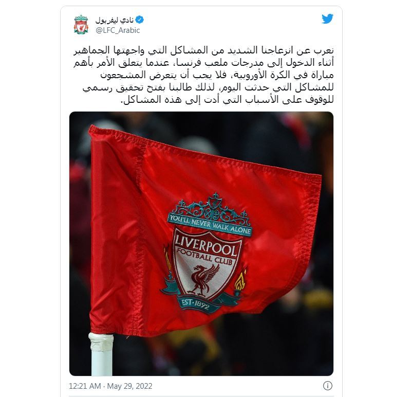 ونشر الحساب الرسمي لنادي ليفربول على موقع “تويتر” بيانا جاء فيه: “نعرب عن انزعاجنا الشديد من المشاكل التي واجهتها الجماهير أثناء الدخول إلى مدرجات ملعب فرنسا، عندما يتعلق الأمر بأهم مباراة في الكرة الأوروبية، فلا يجب أن يتعرض المشجعون للمشاكل التي حدثت اليوم، لذلك طالبنا بفتح تحقيق رسمي للوقوف على الأسباب التي أدت إلى هذه المشاكل”.