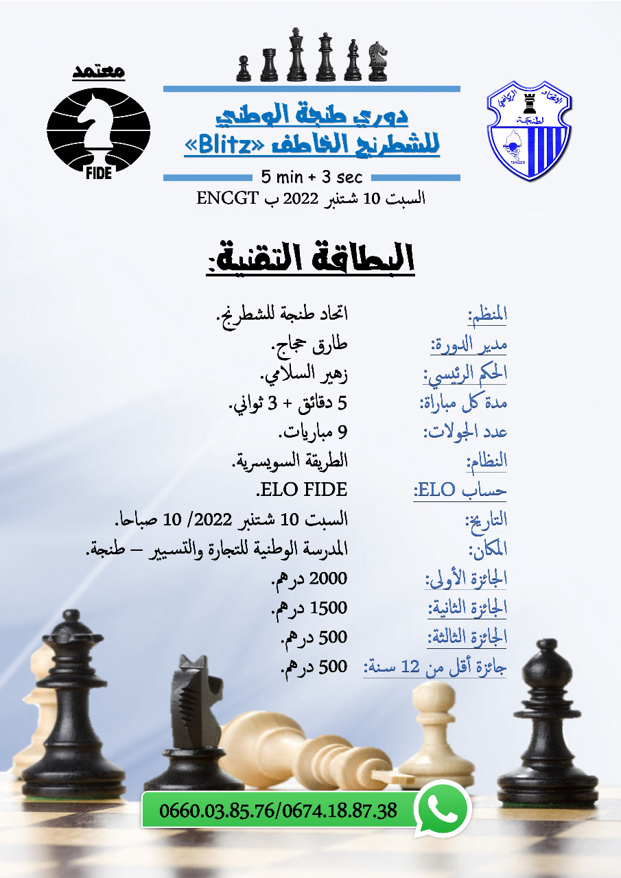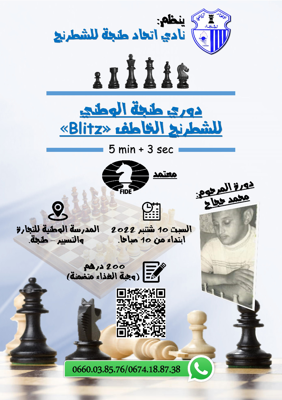 ينظم نادي اتحاد طنجة للشطرنج، يوم غد السبت بالمدرسة الوطنية للتجارة والتسيير، دوري طنجة الوطني للشطرنج الخاطف Blitz.