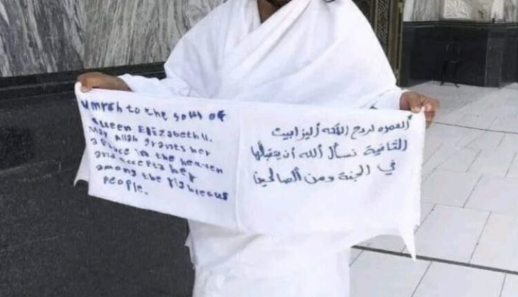 وفي الفيديو ومدته لا تتجاوز 20 ثانية، ظهر الرجل بملابس الإحرام حاملا لافتة بيضاء كتب عليها بخط اليد: “العمرة لروح الملكة إليزابيث الثانية، نسأل الله أن يتقبّلها في الجنّة ومن الصالحين”.