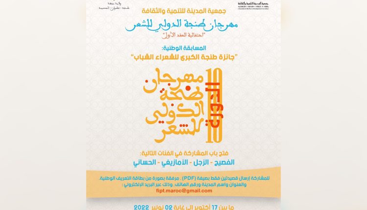 المسابقة تأتي في إطار فعاليات مهرجان طنجة الدولي للشعر في نسخته العاشرة، “احتفالية العقد الأول”، تحت شعار: {بحور الشعر في مجمع البحرين}، والمعتزم تنظيمُه خلال الفترة بين 4 و20 نوفمبر 2022، بفضاءات متنوعة ومختلفة سيتم الإعلان عنها في بلاغ لاحق.