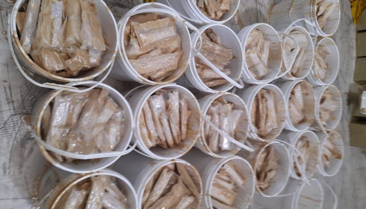 وأضاف البلاغ أن عملية التفتيش المنجزة باستعمال الكلاب المدربة للشرطة قد مكنت من اكتشاف وحجز شحنات المؤثرات العقلية المهربة ملفوفة ومخبأة داخل براميل تحتوي على مواد استهلاكية، حيث بعد فرزها وعدها تبين أنها تناهز مليونين و18 ألف و500 قرص مخدر.