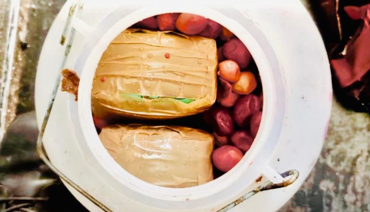 عملية التفتيش بامتعة المعني بالأمر عن حجز ما مجموعه 73 كلغ من مخدر الشيرا مدسوسة داخل قارورات معبأة بالزيتون.