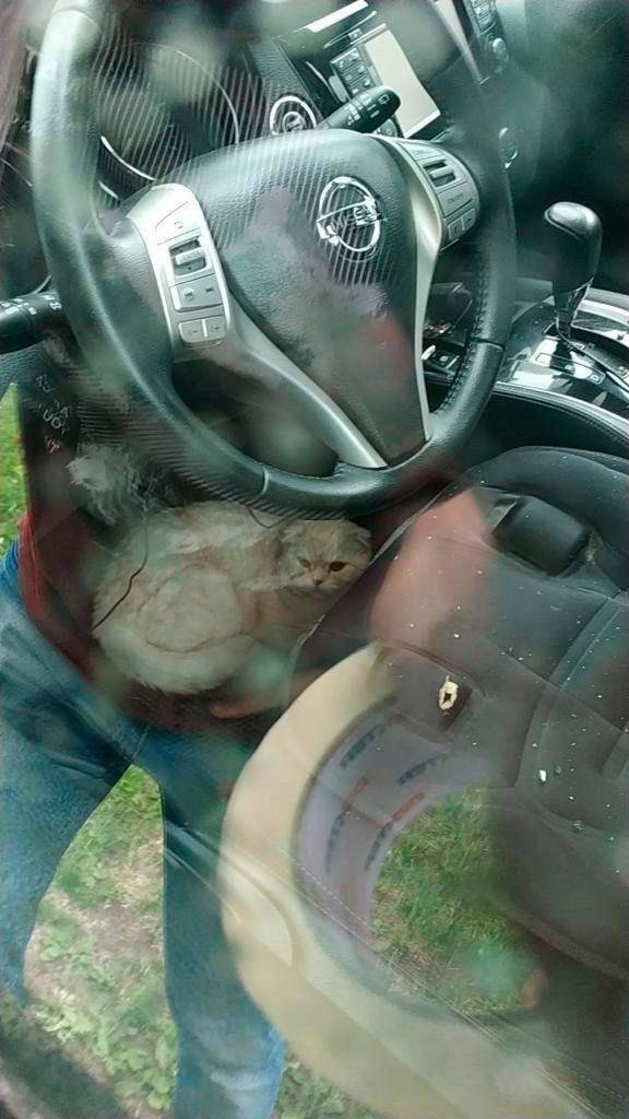 ووجد شهود عيان القطة الخائفة مختبئة تحت مقعد السائق، مؤكدين أن القطة أصيبت بجروح لكنها بقيت على قيد الحياة.