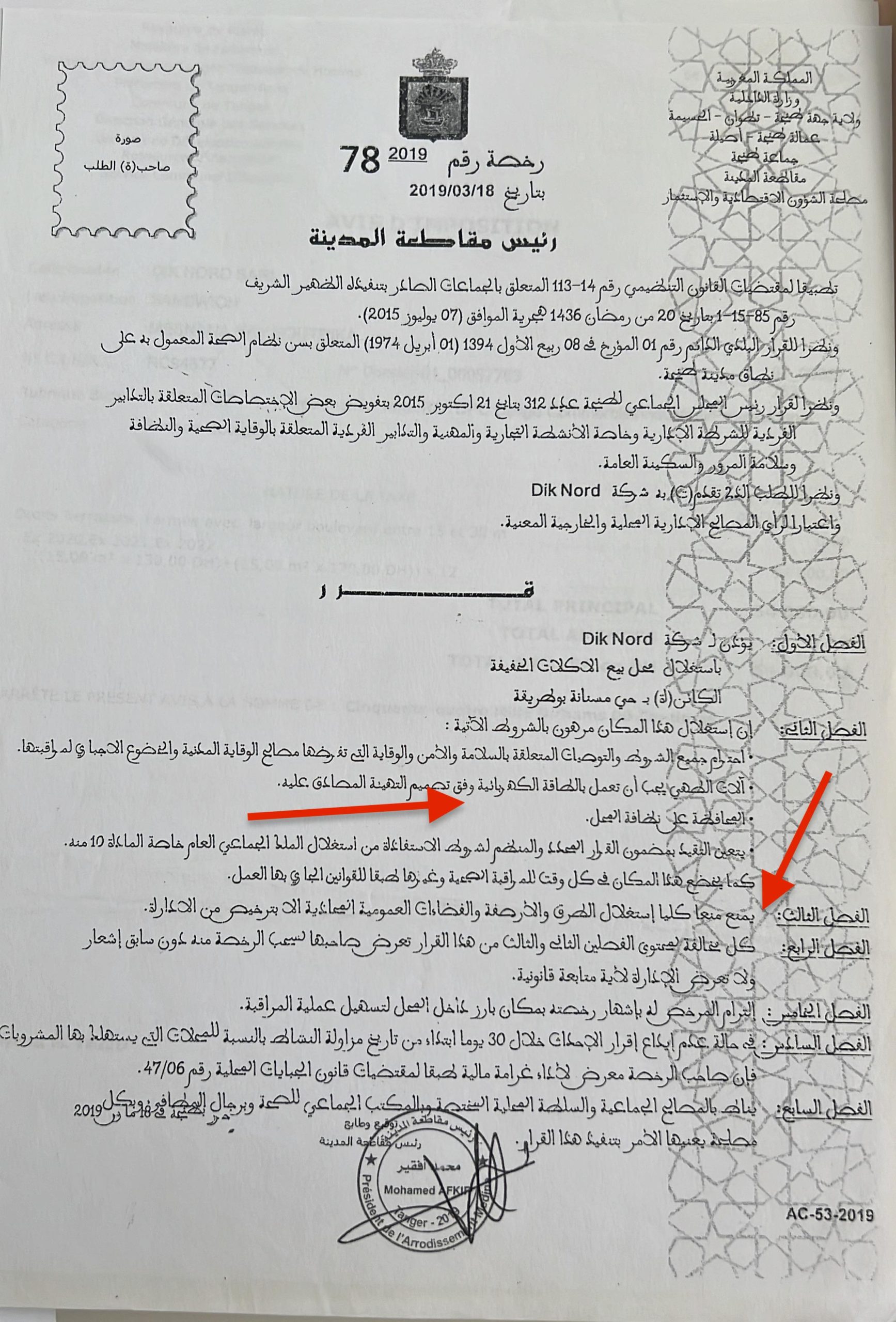 وحسب ما توصلت به طنجة نيوز، فإن صاحب المطعم الذي يقدم وجباته بطهييها على الفحم، بالرغم من أن السلطات منحته ترخيصا لاستخدام الفرن الكهربائي، قام من جديد بتسييج الحديقة التي تقع قبالة مطعمه، كما أنه أغلق الطريق الذي يولج إلى زنقة قريبة في تحد صارخ للسلطات (نسخة من الرخصة أسفله).