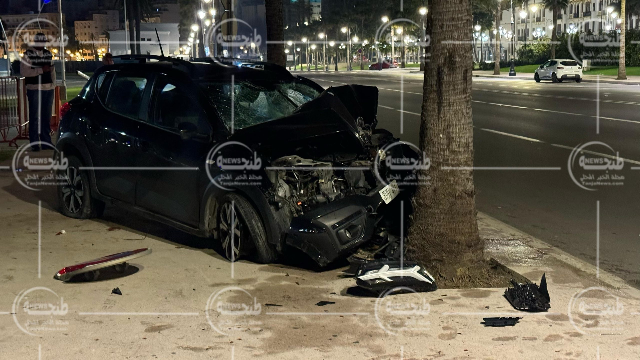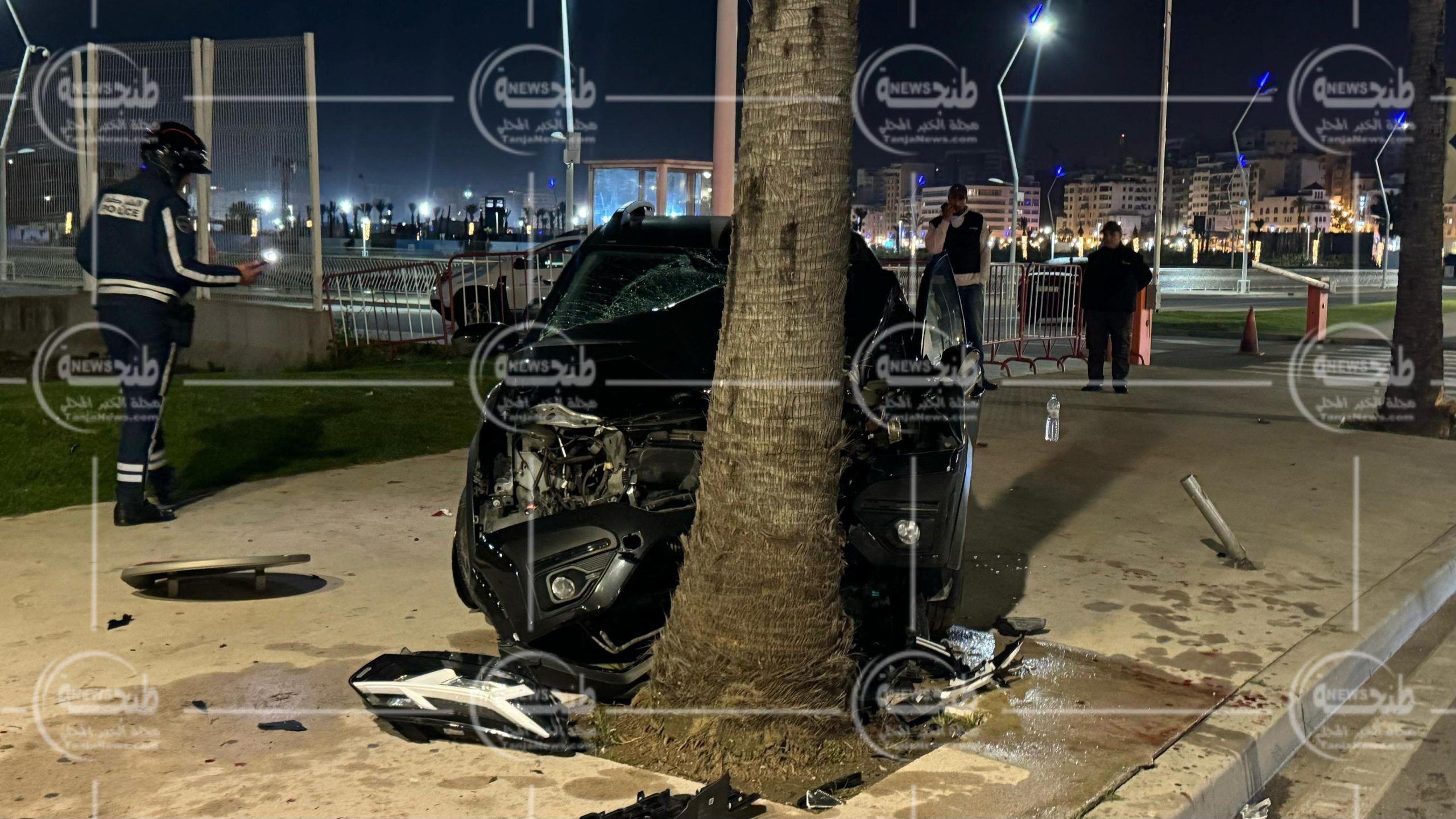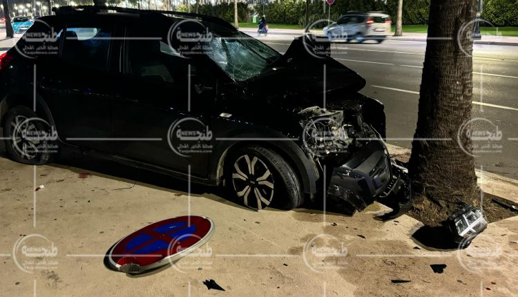 إصابة أربعة أشخاص في حادث اصطدام سيارة بنخلة بكورنيش طنجة (صور)