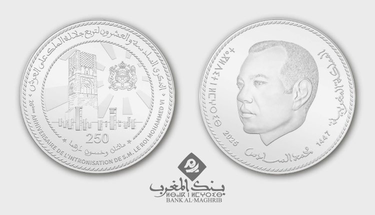 تخليدا للذكرى السادسة والعشرين لتربع صاحب الجلالة الملك محمد السادس على العرش، أصدر بنك المغرب قطعة نقدية تذكارية فضية من فئة 250 درهما.