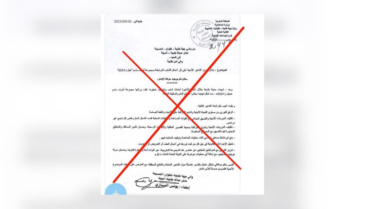 نفى مصدر مطلع، مساء اليوم الخميس، صحة الوثيقة المتداولة على مواقع التواصل الاجتماعي والمنسوبة لوزارة الداخلية، والتي تتحدث عن إجراءات أمنية استثنائية بجهة طنجة تطوان الحسيمة على خلفية ما وُصف بأعمال شغب مرتبطة بمجموعة تحمل اسم “جيل زد 212”.
