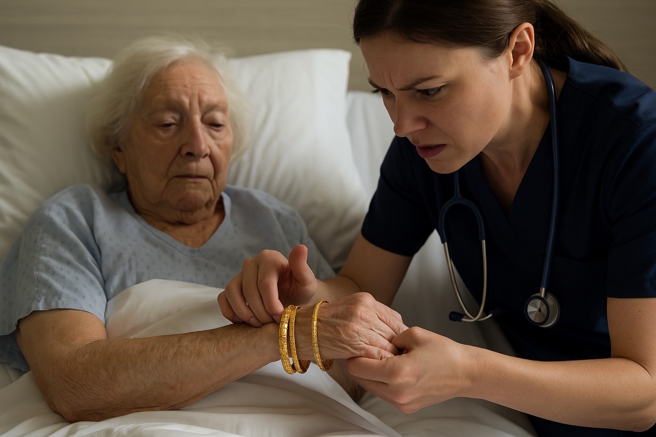 Les membres de la famille ont découvert que les véritables bracelets avaient été remplacés par de faux bijoux bon marché, vendus habituellement dans la rue. Des marques visibles sur le poignet de la patiente laissent penser que les bijoux ont été retirés avec force. La victime elle-même aurait confié à ses proches que des infirmières avaient tenté de lui enlever les bracelets alors qu’elle se trouvait affaiblie et endormie.