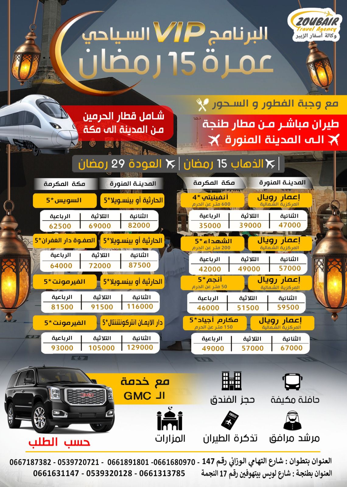 أطلقت وكالة أسفار الزبير برنامجًا فاخرًا لعمرة 15 رمضان، مصممًا خصيصًا للراغبين في الجمع بين الراحة القصوى والخدمات الرفيعة، مع الحفاظ على الأجواء الروحانية المميزة لهذا الشهر المبارك. ويُعد هذا البرنامج أحد أبرز عروض الوكالة لعام 2026، نظراً لما يوفره من جودة تنظيمية عالية وتجربة VIP متكاملة.