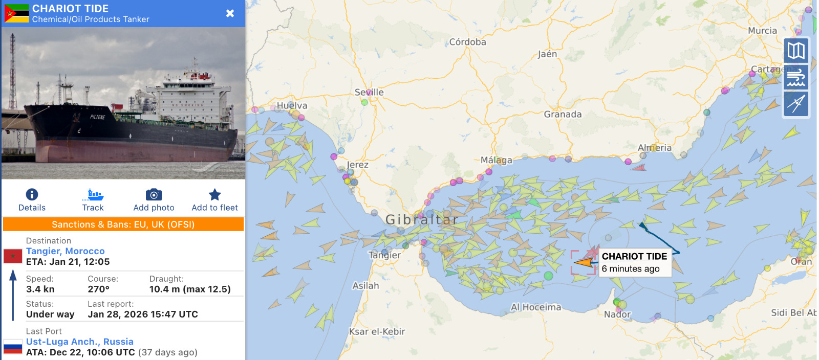 ووفق المصدر نفسه، أعلنت البحرية التجارية الإسبانية أن الناقلة، التي تبحر تحت علم موزمبيق، أُدرجت منذ نونبر 2024 ضمن قائمة عقوبات الاتحاد الأوروبي، بسبب الاشتباه في مساعدتها لروسيا على تصدير النفط عبر ممارسات شحن وُصفت بـ«غير النظامية وعالية المخاطر».