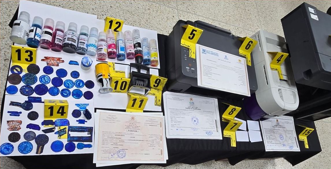 وقد مكنت عملية الضبط والتفتيش المنجزة داخل نادي الأنترنت ومنزل المشتبه فيه الرئيسي من حجز 48 دبلوماً وشهادة دراسية وبيانات نقط مزورة، إضافة إلى 41 خاتماً إدارياً مزيفاً، فضلاً عن ثلاثة حواسيب وثلاثة أجهزة للطباعة يُشتبه في توظيفها لتسهيل ارتكاب هذه الأفعال.
