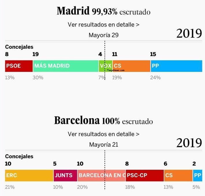 وجدير بالذكر أن حضور مدريد وبرشلونة في هذا العنوان إنما للأهمية المركزية للمدينيتين في المنظومة السياسية والديمغرافية والرمزية، مما يجعل الفوز ببلدية مدريد مثلا، من طرف الحزب الشعبي يغطي على التراجع المهول لهذا الحزب مقارنة مع الانتخابات الجماعية الماضية، من 21 مقعدا سنة 2015 الى 15 مقعدا في 2019. الشيء الذي جعل إحدى الصحف تصف تصدر الحزب الشعبي لنتائج اليمين بأنه “منح الاكسيجين” لزعيم الحزب “كاساذو” الذي سارع واصفا تلك النتيجة بما عرف في قاموس كرة القدم الاسبانية ب “الريمونتاذا” أو العودة في النتيجة من بعيد.
