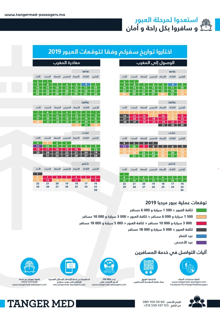 ودعت السلطة المينائية مستعملي ميناء طنجة المتوسط للمسافرين إلى اختيار تواريخ السفر الملائمة وفق توقعات عملية العبور 2019 من أجل السفر بكل “راحة وأمان”، داعية المسافرين إلى متابعة مستجدات الميناء والتواصل مع الإدارة عبر المنصات الرقمية وتطبيقات الهواتف الذكية وإذاعة طنجة المتوسط.