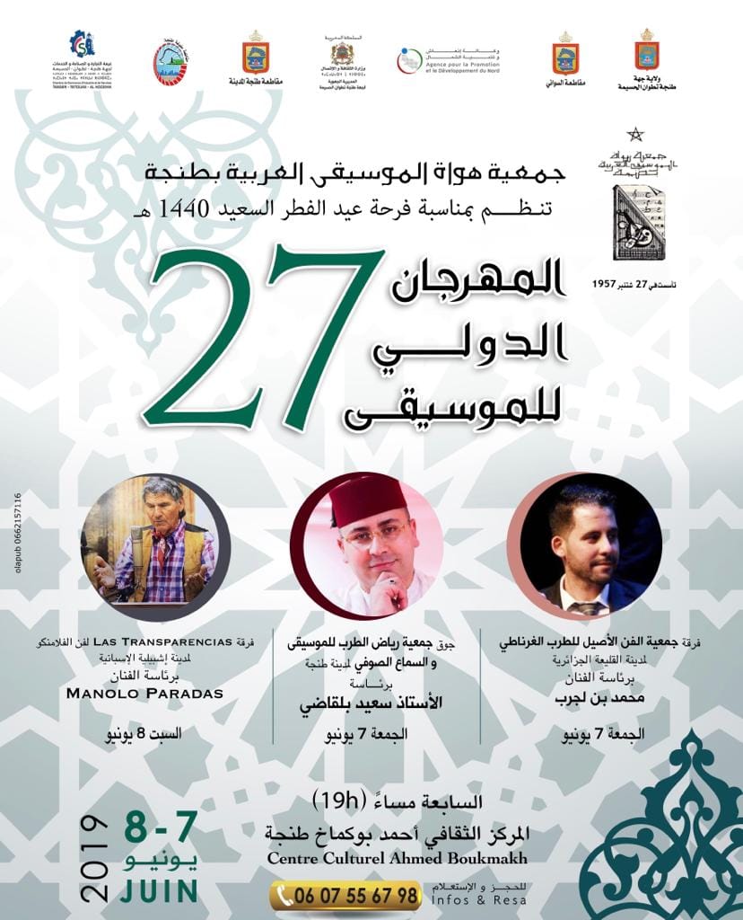 في إطار إدماج الشباب وإشراكه في إحياء التراث الموسيقي الأصيل، تُنظم جمعية هواة الموسيقى العربية بطنجة بمناسبة فرحة عيد الفطر السعيد لعام 1440هـ مهرجانها الدولي السابع والعشرون (27) للموسيقى، يومي الجمعة والسبت 7-8 يونيو 2019م ابتداءً من الساعة السابعة (19h) مساءً بالقاعة الكبرى فريدة بليزيد بالمركز الثقافي أحمد بوكماخ.