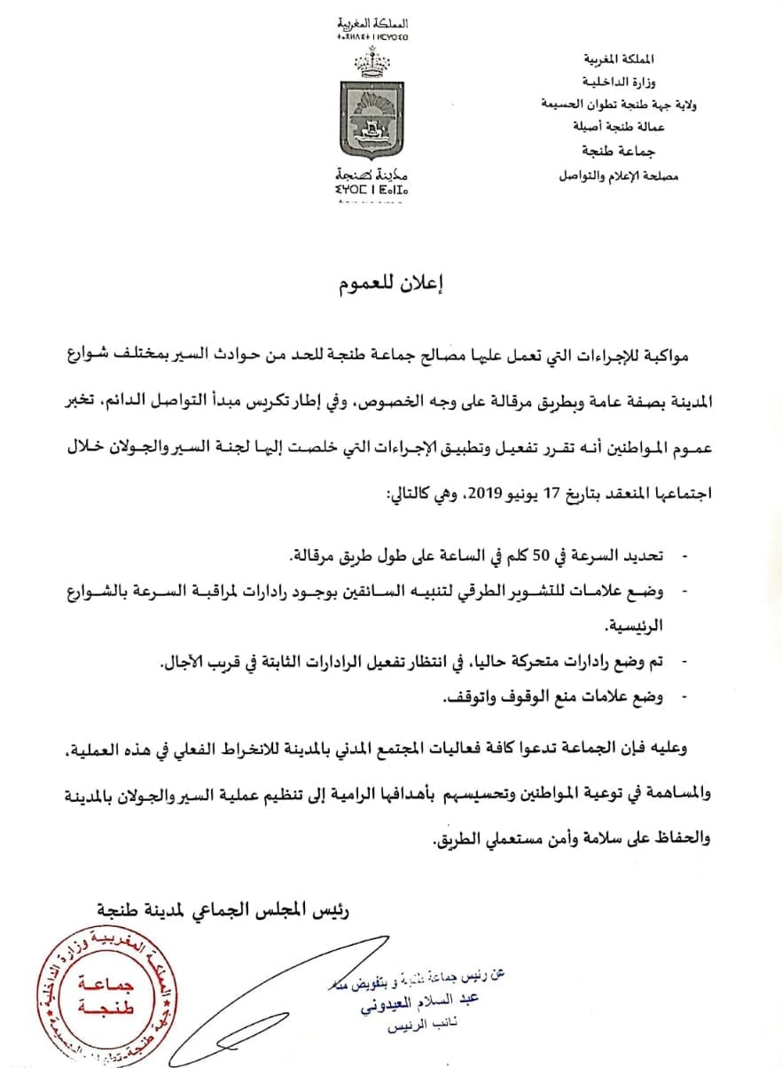 قالت جماعة طنجة في إعلان لها، اليوم الأربعاء، أنه تم تحديد السرعة في 50 كلم في الساعة على طول طريق مرقالة، كما تم وضع رادارات متحركة حاليا، في انتظار تفعيل الرادارات الثابتة في قريب الآجال.