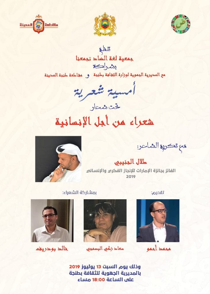 إيمانًا منها بأهمية الثقافة والأدب، في ترسيخ القيم الإنسانية، والإعلاء من شأن الكلمة التي ترقى بالمستوى الجماليِّ العامّ ، تنظِّمُ جمعية “لغة الضاد تجمعنا “، بشراكة مع المديرية الجهوية لوزارة الثقافة جهة طنجة تطوان الحسيمة ، ومقاطعة طنجة المدينة ، أمسية شعريةً يضيئها شعراء جعلوا أسماءهم مصابيحَ تضيءُ الوعي الإنسانيَّ.