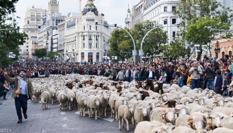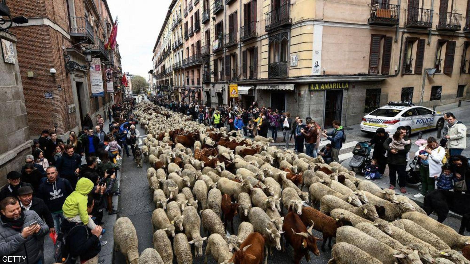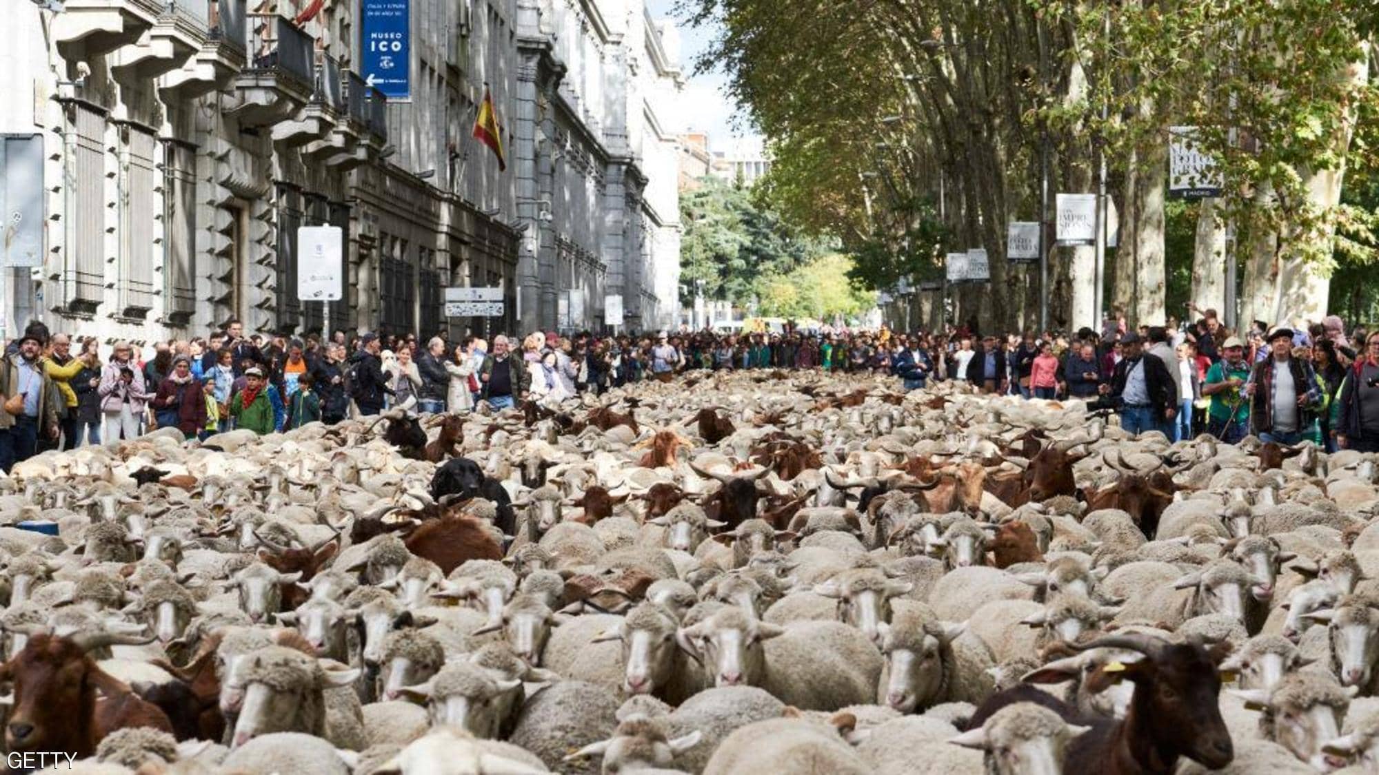 احتلت الأغنام شوارع العاصمة الإسبانية مدريد، الأحد، حيث ساق الرعاة قطعانهم من الأغنام والماعز في قلب المدينة، مارين بمسارات قديمة للهجرة السنوية.
