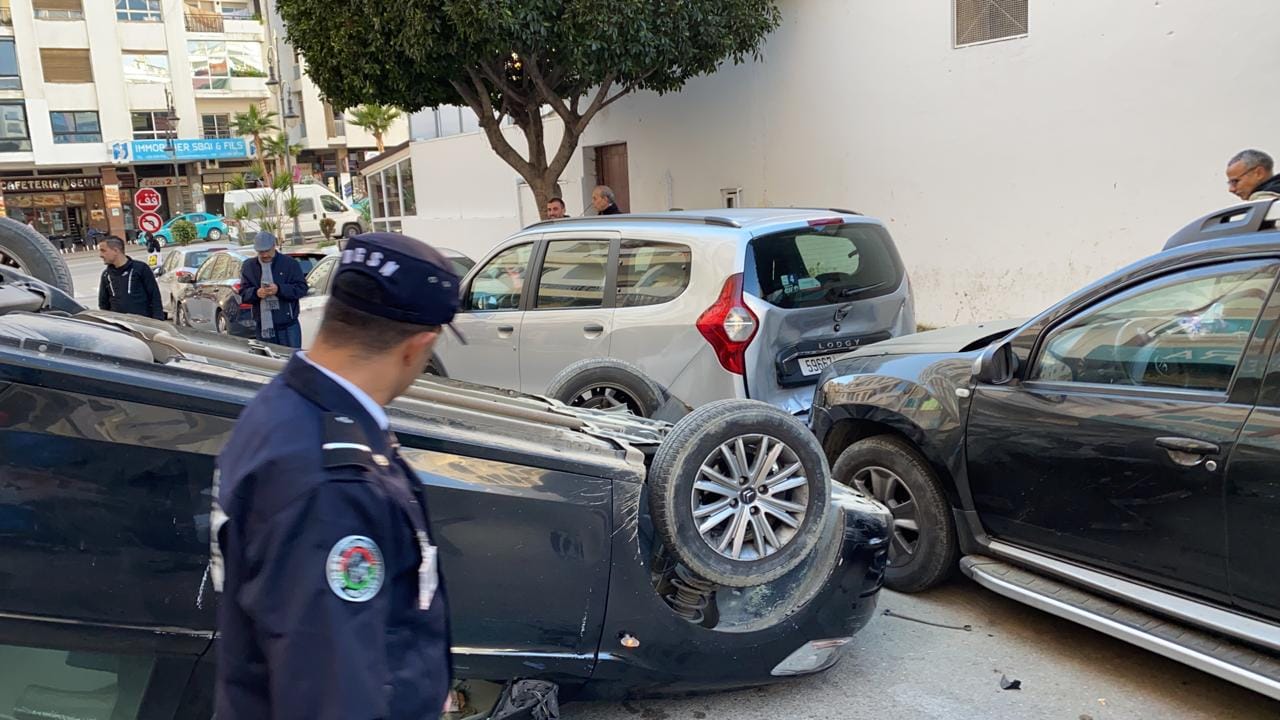 إصابة شخص إثر انقلاب سيارة بعد اصدامها بسيارات أخرى بطنجة