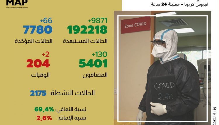 وقال منسق المركز الوطني لعمليات طوارئ الصحة العامة بوزارة الصحة، معاد لمرابط، في تصريح نقلته وكالة المغرب العربي للأنباء مباشرة على قناتها “M24″، وإذاعتها “ريم راديو”، إنه تم تسجيل حالتي وفاة جديدة خلال الساعات الـ24 الأخيرة ليرتفع العدد الإجمالي إلى 204 حالة وفاة.