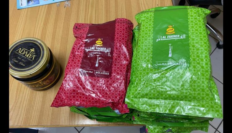 و في نفس الإطار و المتعلق بمحاربة المواد الضارة بالصحة العمومية و خرق الحجر الصحي تمكنت مصالح الدائرة الامنية الخامسة من توقيف سائق سيارة نفعية تم اخضاعها للتفتيش و تبين انها تحمل في صندوقها الخلفي اكياس لمادة المعسل المهربة بلغت وزنها 9 كيلوغرامات، حيث تم وضع السائق رهن تدبير الحراسة النظرية لخرقه مقتضيات الحجر الصحة و كذا حيازته لمادة المعسل المهربة و غير المصرحة جمركيا.