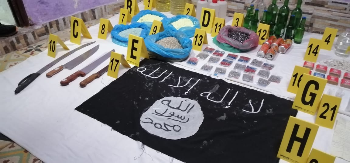 وتابع المصدر أن عمليات التفتيش التي أجراها ضباط المكتب المركزي للأبحاث القضائية وخبراء مسرح الجريمة بهذا المسكن الأخير، وبمنازل المشتبه فيهم، أسفرت عن حجز راية من الثوب تجسد شعار تنظيم “داعش”، ومخطوط ورقي يتضمن نص البيعة للخليفة المزعوم لهذا التنظيم، ومجموعة من الأسلحة البيضاء المتعددة الأنواع والمختلفة الأحجام، ومعدات معلوماتية وأجهزة إلكترونية.