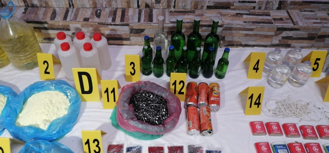وأضاف البلاغ أن إجراءات التفتيش مكنت كذلك من حجز مجموعة من المعدات والمستحضرات الكيميائية التي تدخل في صناعة العبوات المتفجرة التقليدية، من بينها أكياس تحتوي على مادة الكبريت والفوسفور، وبراميل تضم وقود البنزين، وقنينات مملوءة بالكحول الحارق، وأكياس معبأة بكميات كبيرة من براغي لولبية وكريات معدنية ومسامير، بالإضافة إلى أسلاك كهربائية وبطاريات إلكترونية، وقنينات زجاجية فارغة يشتبه في تسخيرها لتحضير قنينات المولوتوف، ومواد سائلة مشبوهة سوف يتم عرضها على الخبرة التقنية لدى مختبر الشرطة العلمية والتقنية.