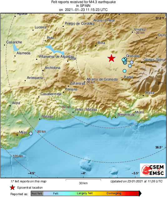 وأوضح المصدر ذاته، أن مركز هذه الهزة، التي وقعت في الساعة 12:15 بالتوقيت المحلي، يقع على بعد 13 كلم من Granada.