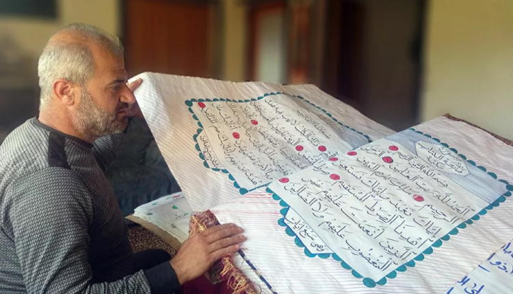 شاب يخط نسخة عملاقة من القرآن الكريم بأدوات بسيطة
