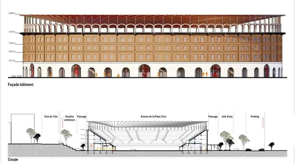 وستكون ساحة الثيران محاطة بفضاء عمومي مكون من مرائب للسيارات وتجهيزات حضرية ونافورة وساحة عمومية ،قادرة على استيعاب 120 شخصا ، وفضاء للعرض الخارجي.
