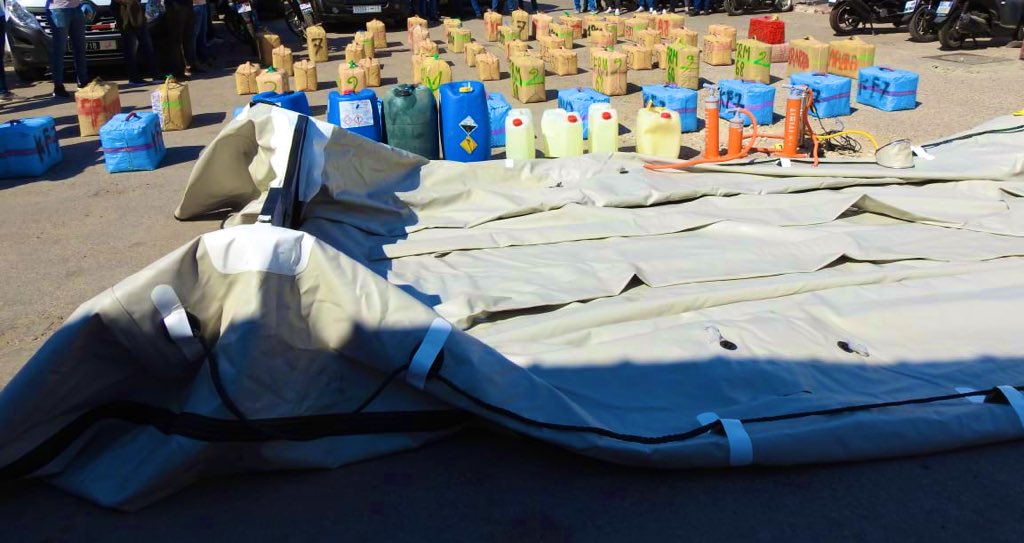 وأضاف المصدر ذاته أن عمليات التفتيش المنجزة بمنزل يستغله المشتبه فيهم بمنطقة ” تغازوت “، مكنت من ضبط ثلاثة مرشحين للهجرة غير المشروعة، فضلا عن حجز شحنة مكونة من 64 رزمة من مخدر الشيرا المعد للتهريب الدولي، بلغ وزنها الإجمالي طنين (02) من هذه المادة المخدرة، بالإضافة إلى حجز قارب مطاطي وكمية من الوقود ومجموعة من المعدات والتجهيزات المستعملة في الملاحة البحرية.
