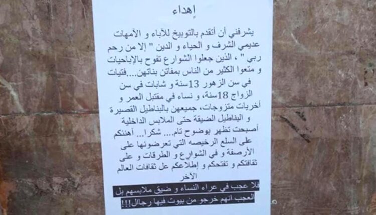 وجاء في المنشورات أن “الشوارع صارت تفوح منها الإباحيات لتعمد الفتيات إظهار مفاتنهن بارتداء السراويل الضيقة والبناطيل القصيرة”.