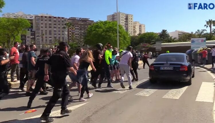 واستقبل عشرات المحتجين ملثمين بالأعلام الإسبانية رئيس الحكومة، محاولين اختراق جدار أمني يفصل سيارات الوفد عن المحتشدين، لكن رجال الشرطة منعوا أي انفلات ممكن.